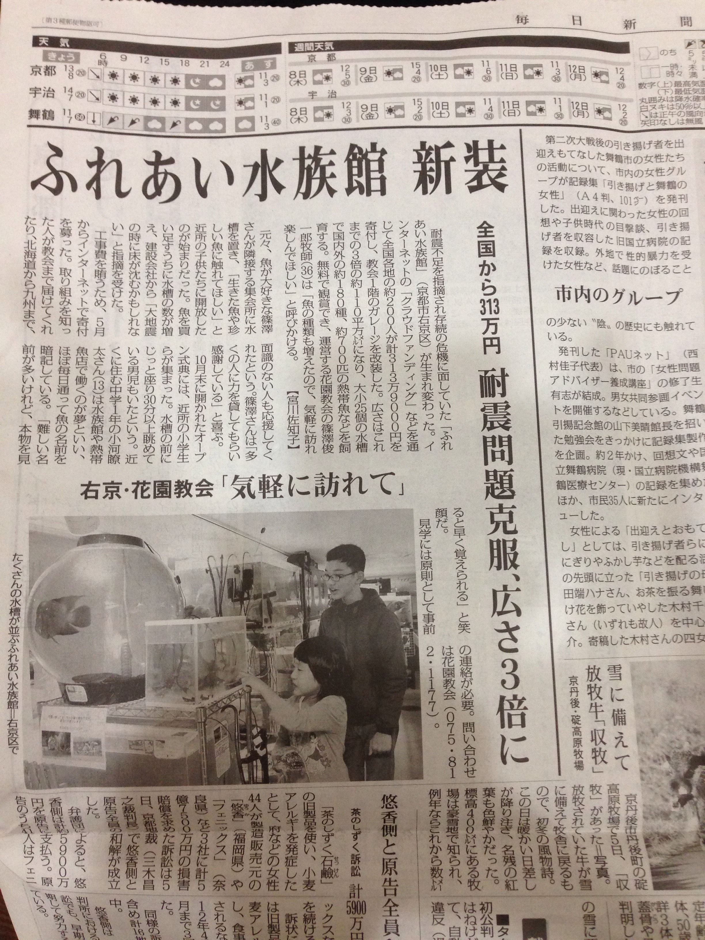 本日、毎日新聞にて花園教会水族館が掲載されました!