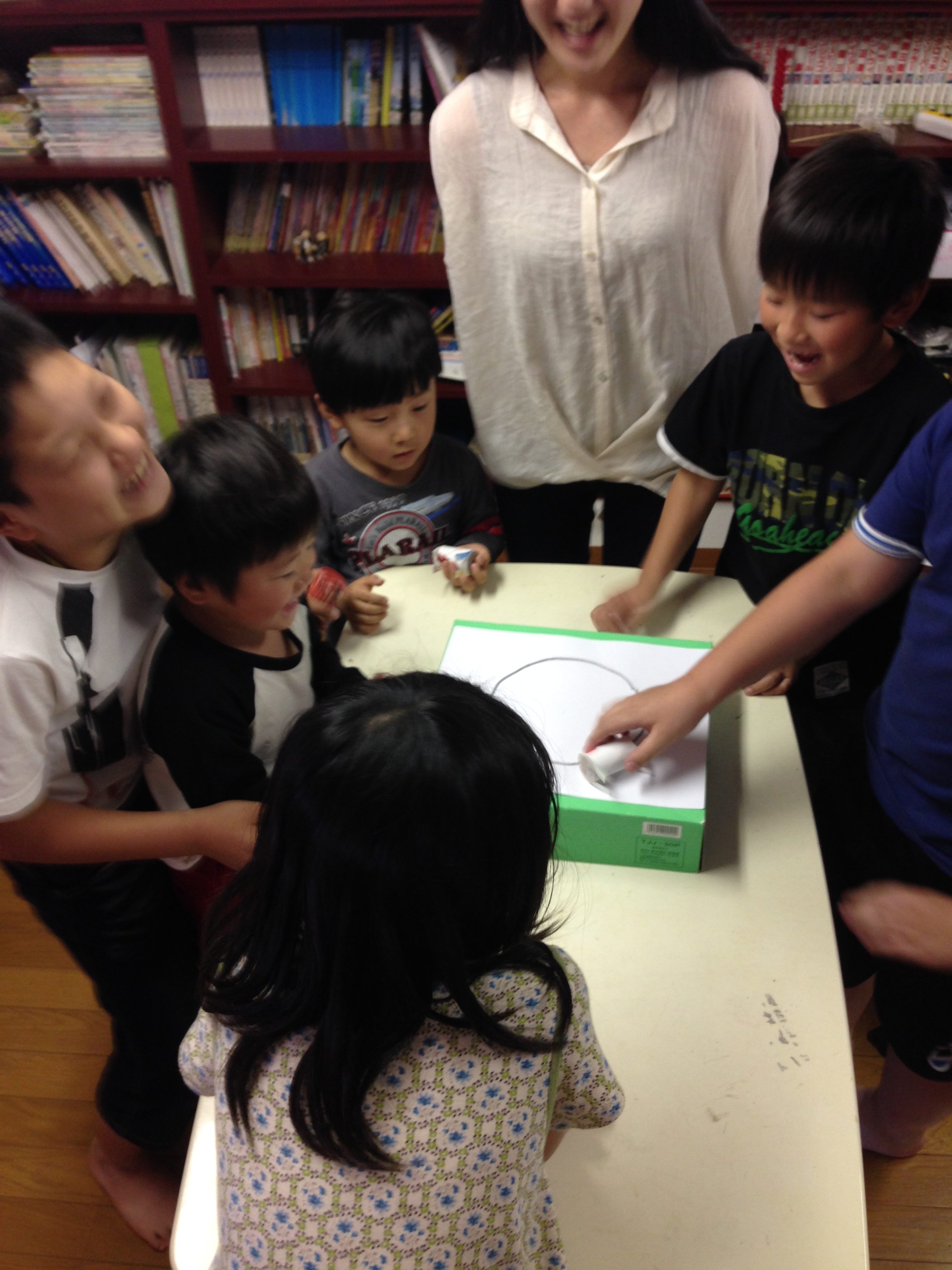 それぞれ工作で作った、紙の相撲で「はっけよい、、のこった!」