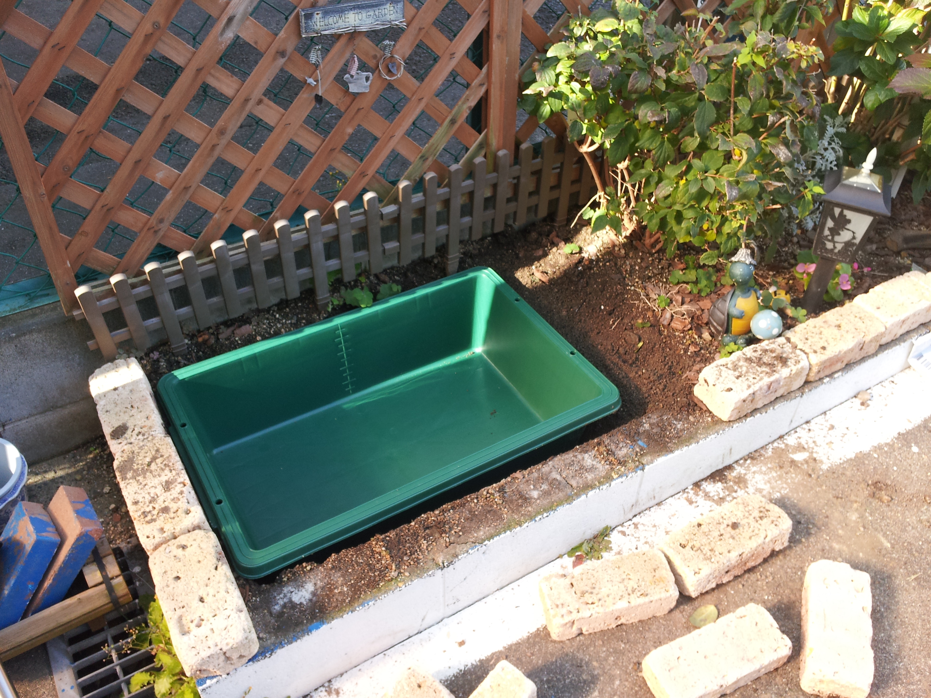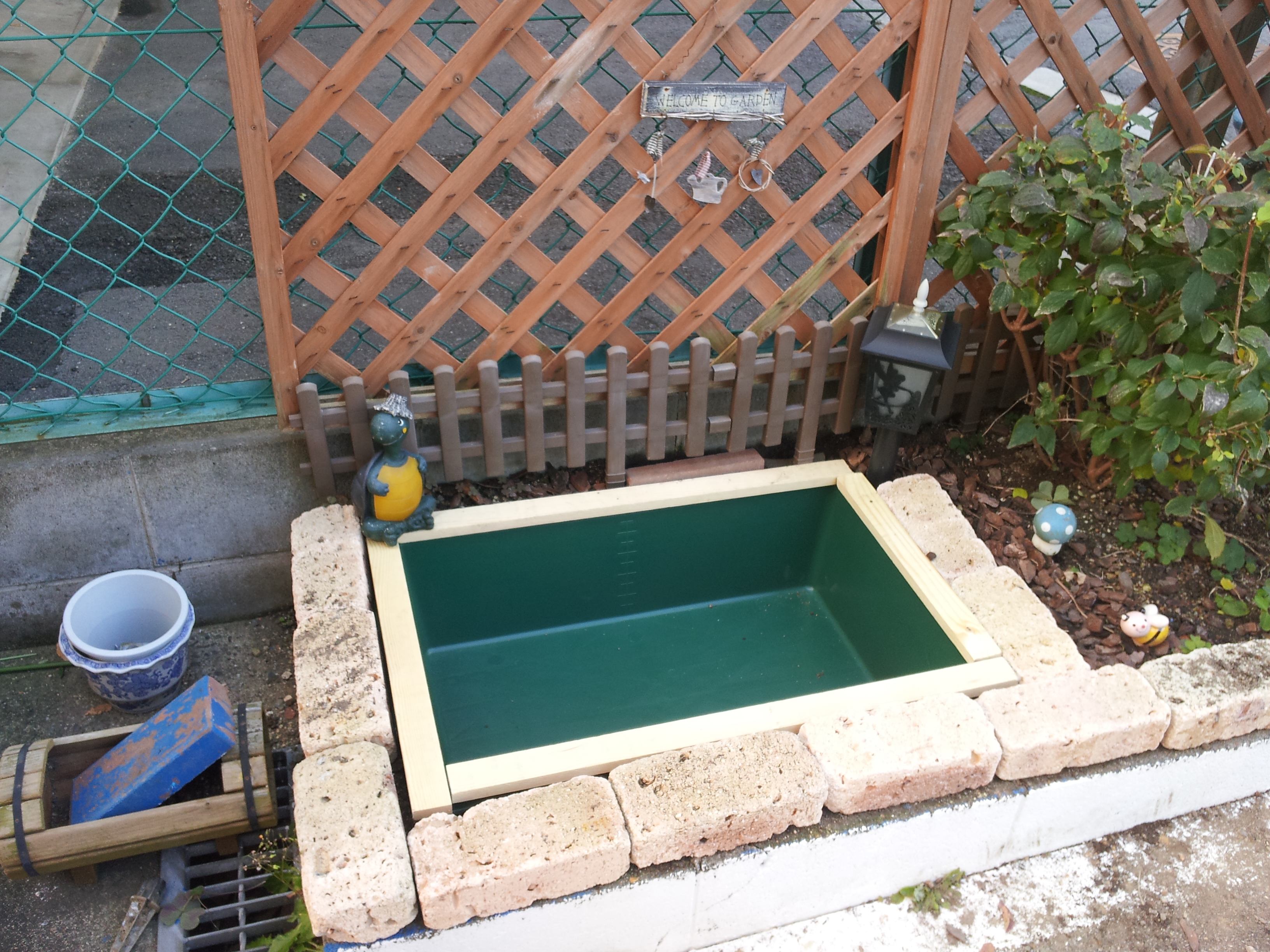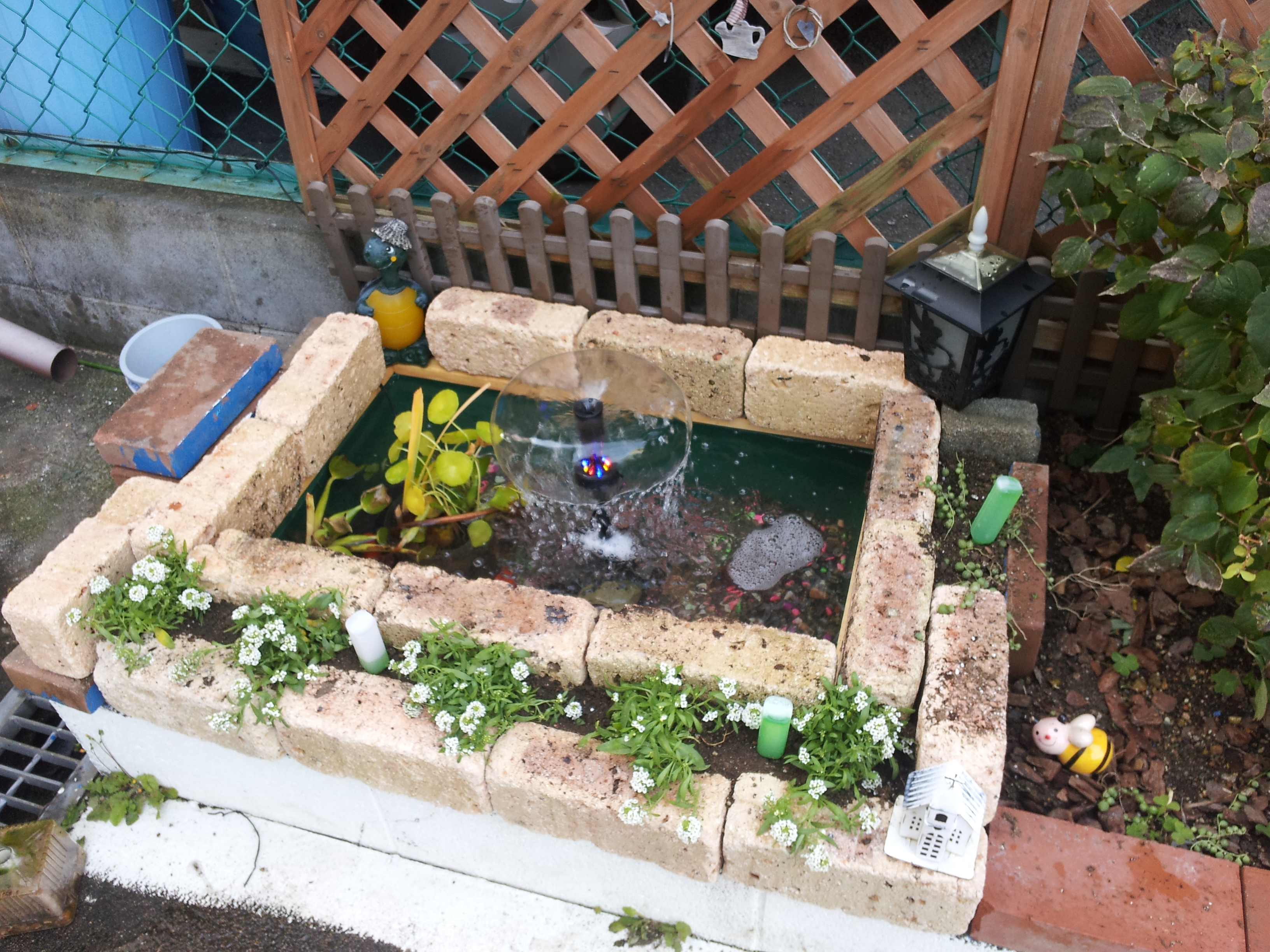④ その周りをこれまた教会においてあったレンガを積み上げて周りを囲み、余っていた水槽用の砂利を容器の中に入れます。