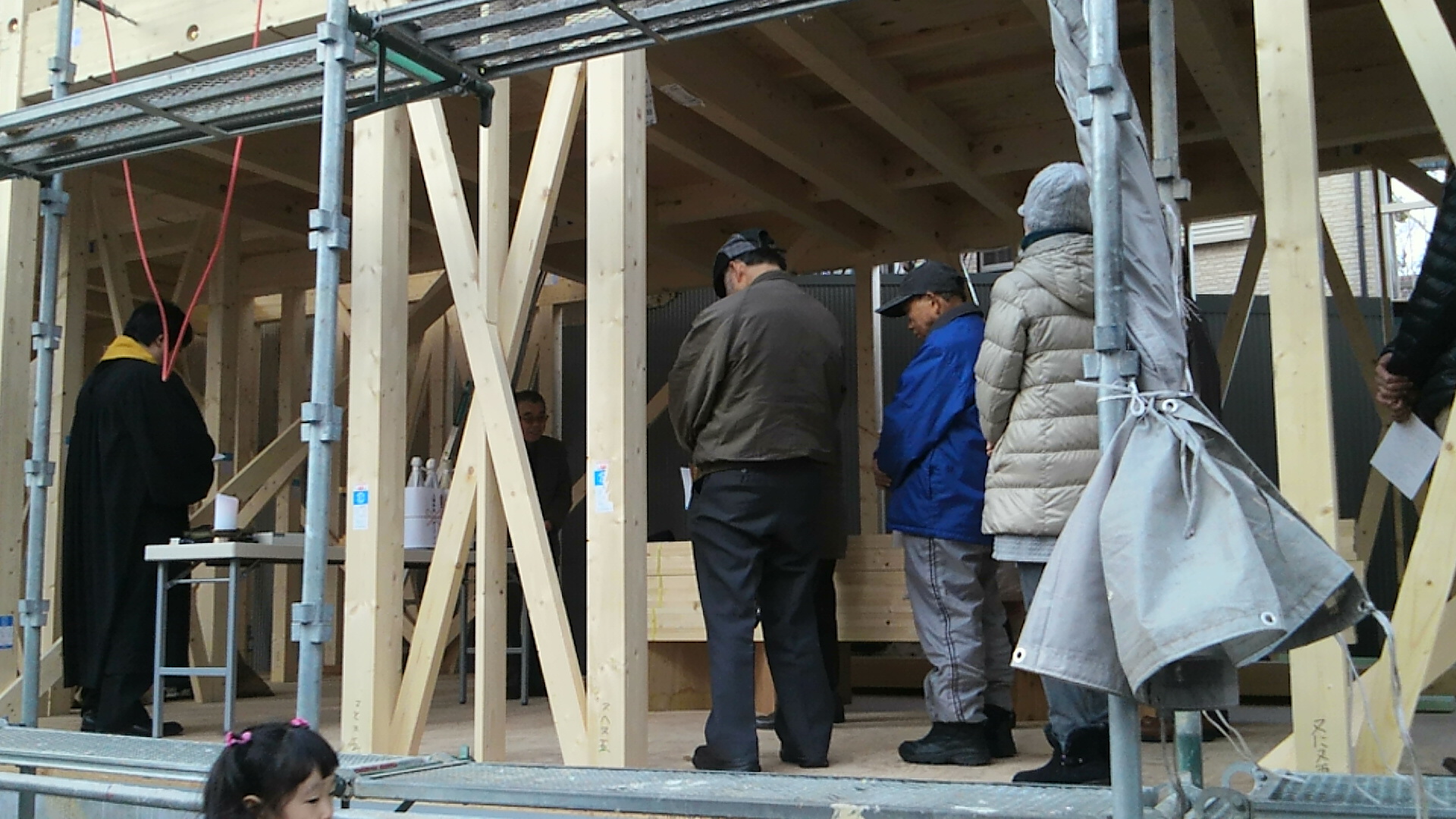 この日の上棟式では、祭壇を作り、大工さんに振る舞われるお弁当とお酒を祭壇にささげ、