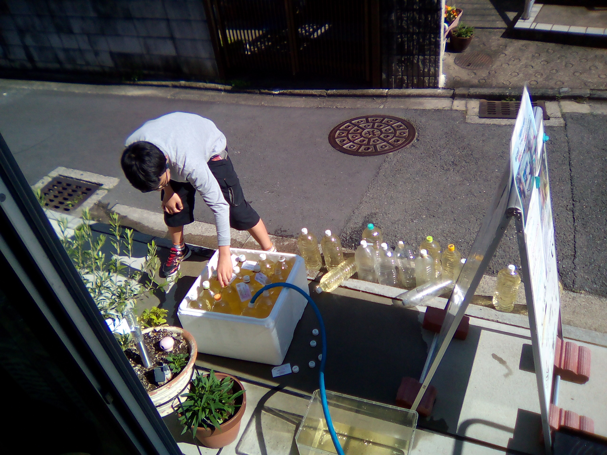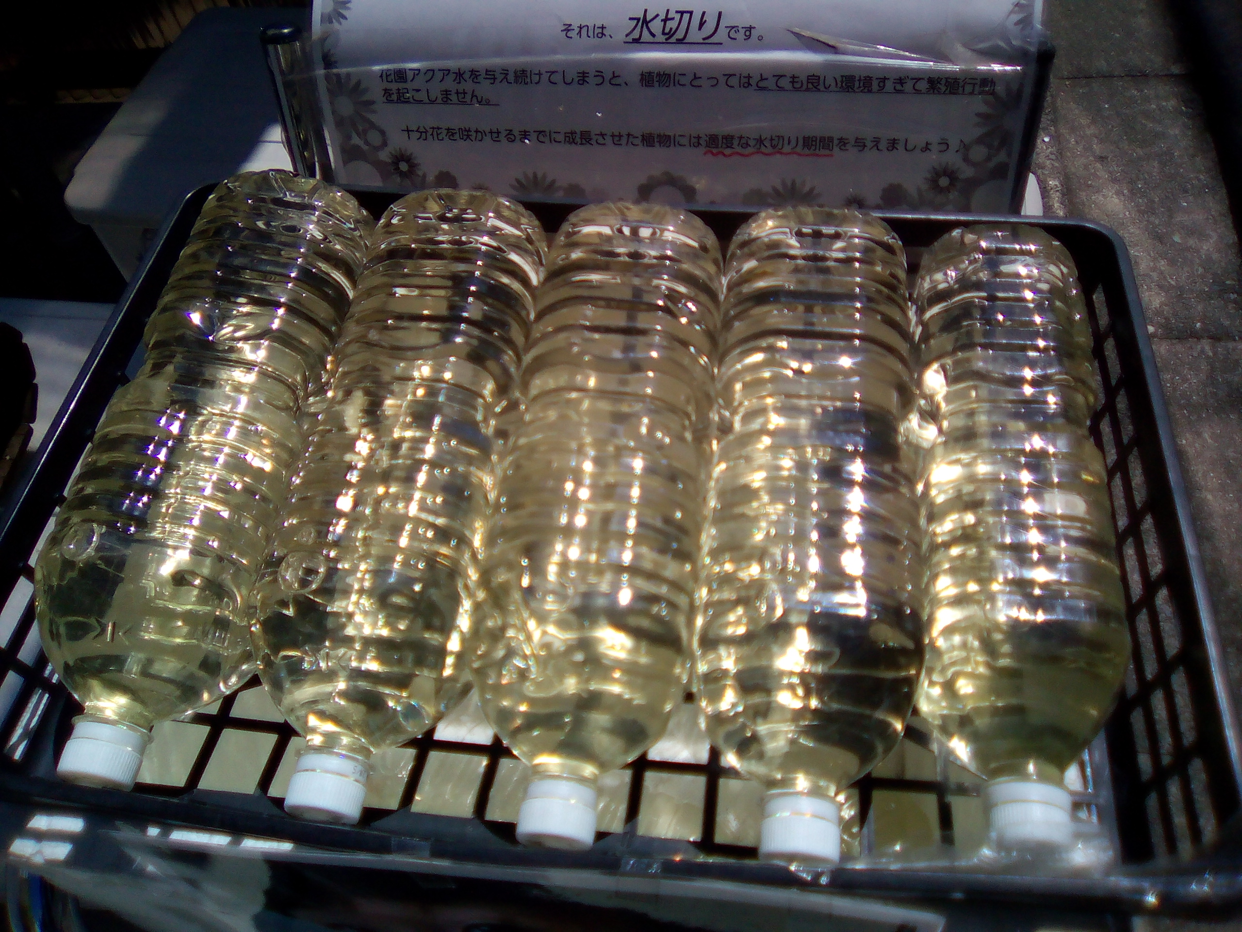そんなこんなで、アクア水の実験もしてその効果が立証されたという事で、昨年の11月から、水替えで捨ててしまうのはもったいないので、近隣の方々のガーデニングに役立ててもらおうと、配布し始めました。