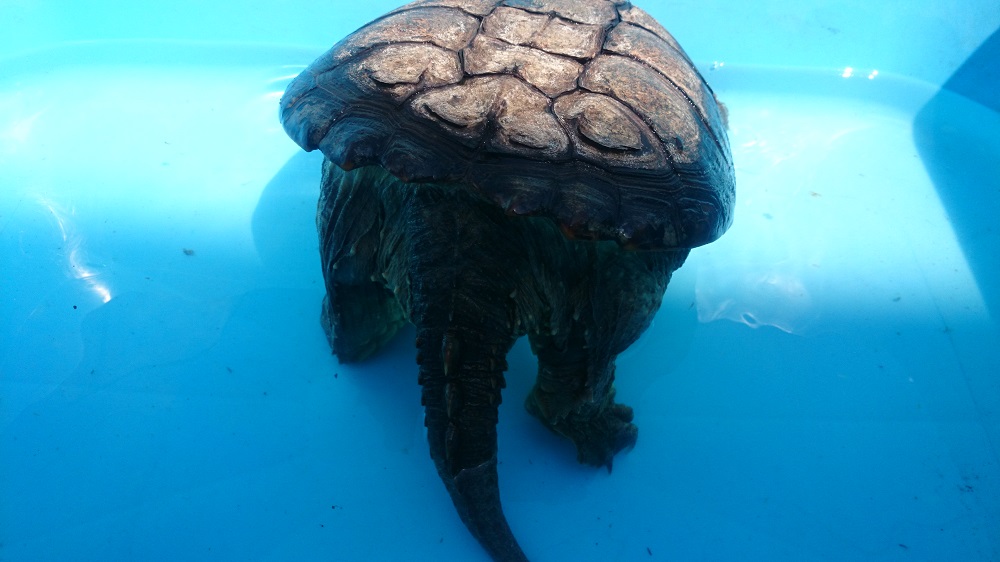 カミツキガメは威嚇体制になると後ろ足をそります。