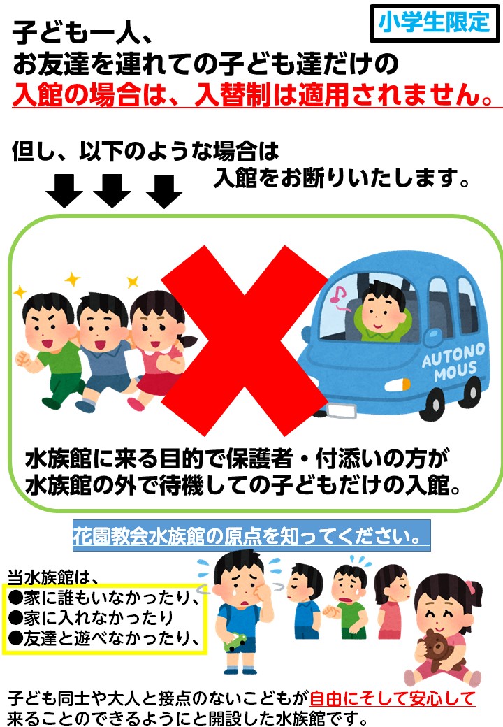 ④子どもだけの来館の場合は入替制の制限はありません。但し、不正等があった場合は入館をお断りします。