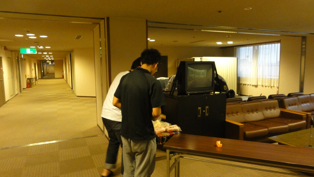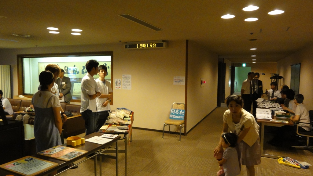 こんな感じのロビーで学生達がうっていました。この写真の右手奥が集会をやっているホール。
