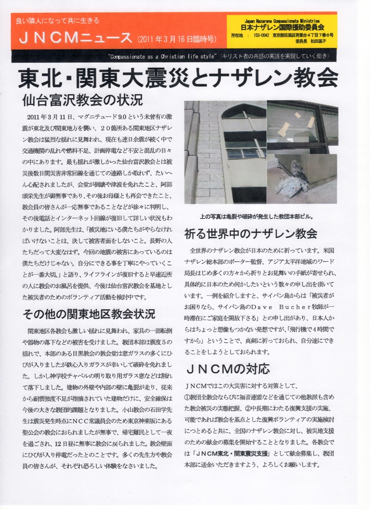 ナザレン国際援助委員会から仙台・そして首都圏の教会の情報を載せた臨時号を発行いたしました。