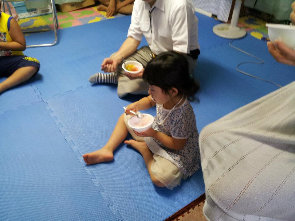 カキ氷を食べながら今日も絵本の読み聞かせ。