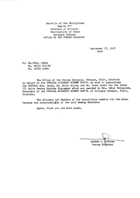 コタバト州ピキット・タキュパンバランガイ・プノン村事務局は、イスラム女性グループ(UMBAIKA KUTAWOTO WOMENS ASS’N)及びグループ代表のUmbai Maligananに代わり、3台のミシンをご寄贈下さった、●●ご夫妻、●●様、●●様に心から感謝申し上げます。