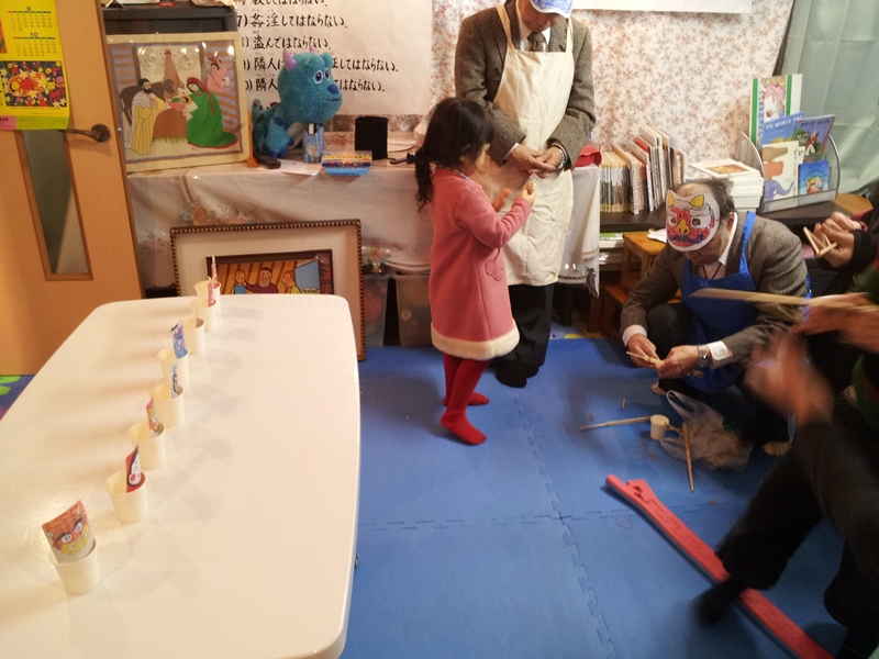 リトミックで体を動かし、絵本で表現を養った後は、外に出てみんなで豆まきしてハッスルするつもりです。