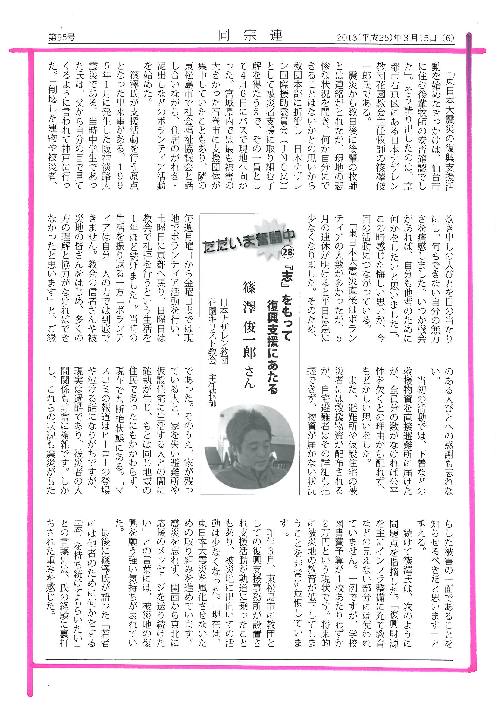 花園教会やナザレンJNCM、東北ブリッジでの支援活動をしている篠澤主任牧師が、