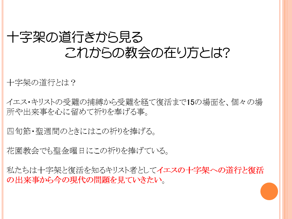 私は、午前中の基調講演を任されたので、今回は「十字架の道行」を題材に、これからの教会の在り方について考えてみようと思いました。