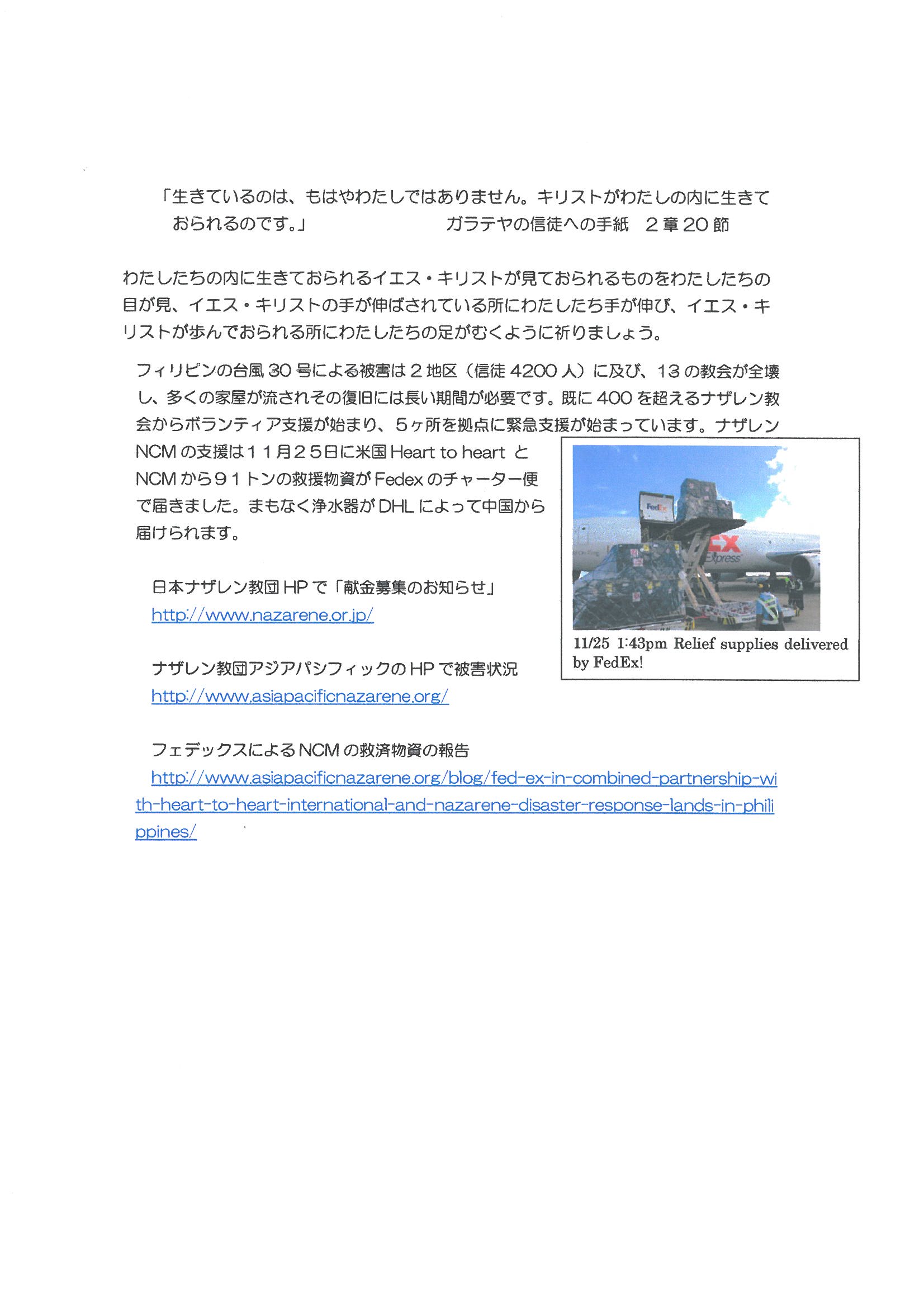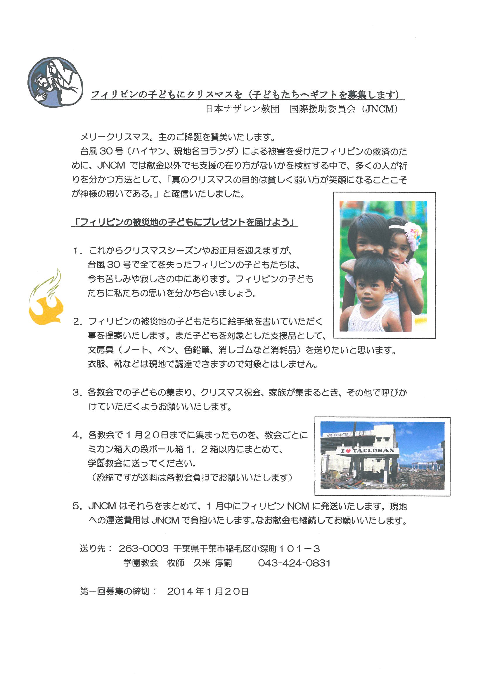 フィリピン災害支援として文具やキッチン用品(割れない)などの物資支援を行う事となりました。各ナザレン教会に調達をお願いする予定です。 資料を添付します。ご覧ください。