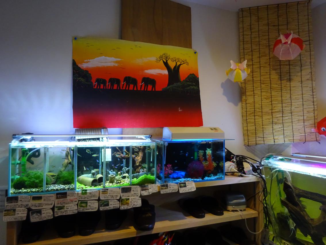 お茶を飲みながら、水槽見て癒されてほしいというのがその目的