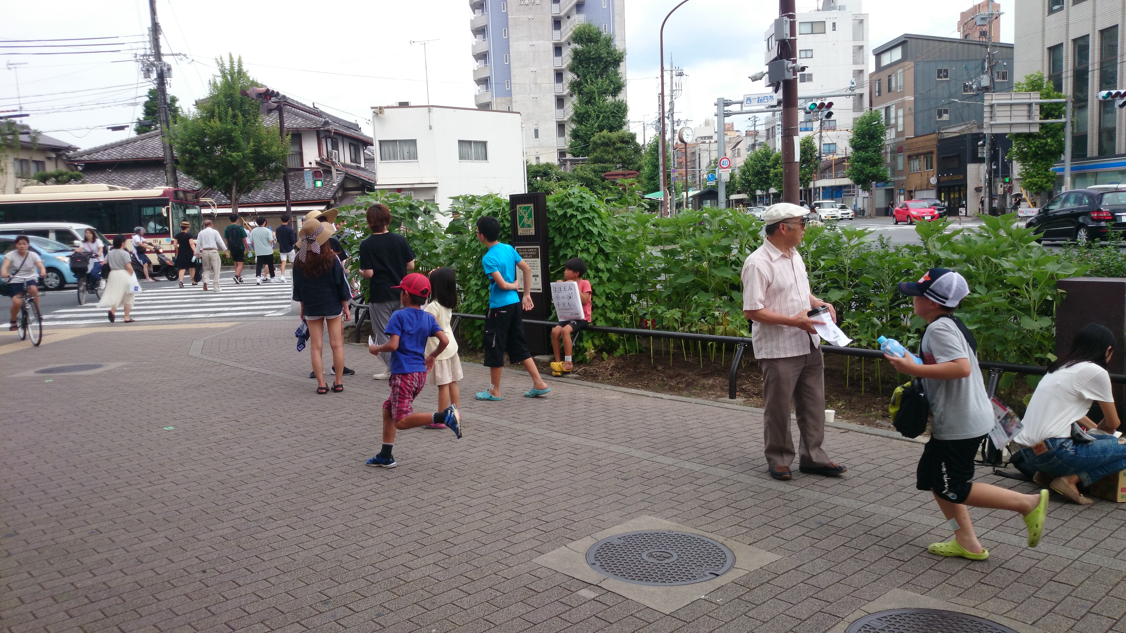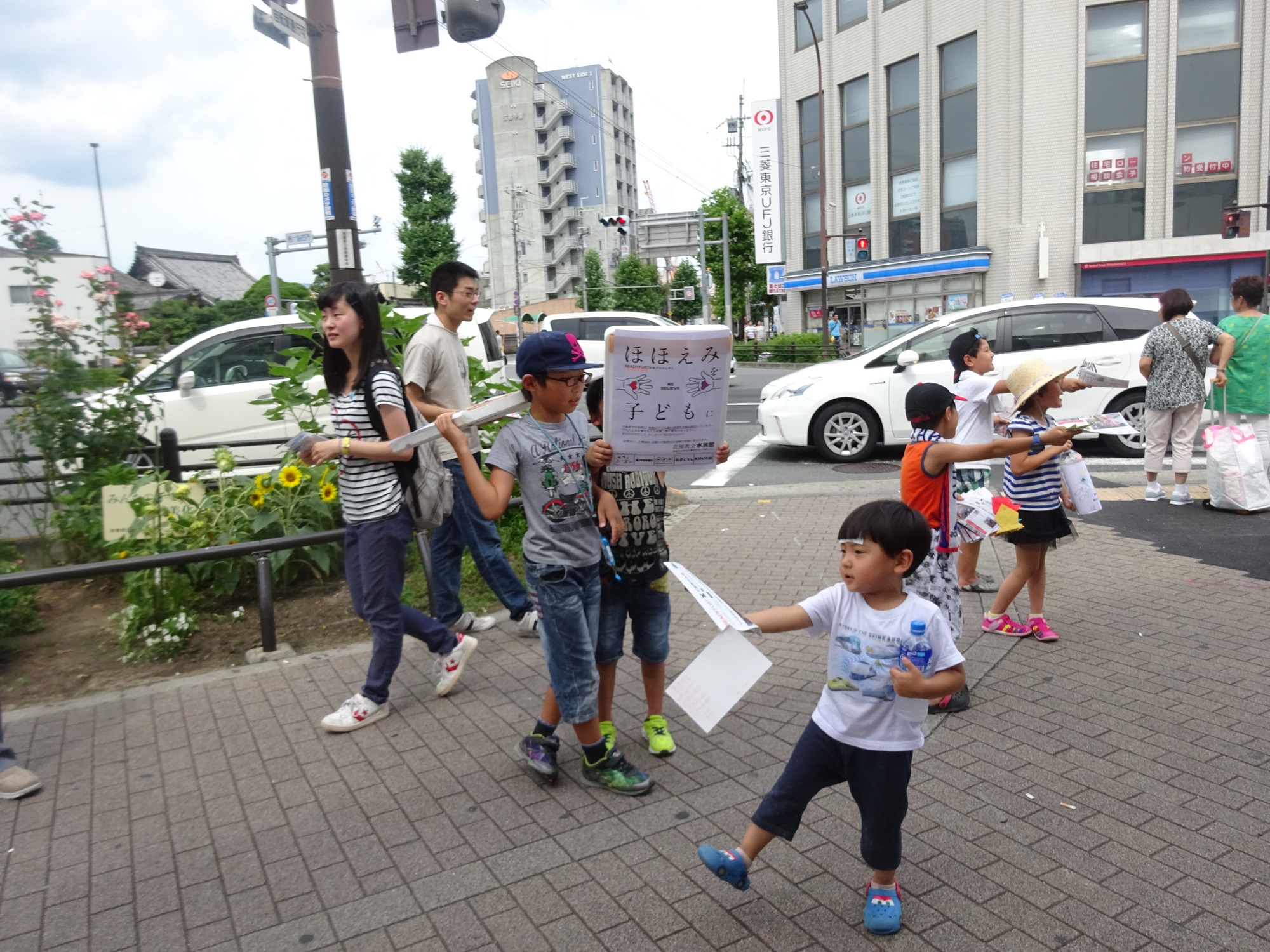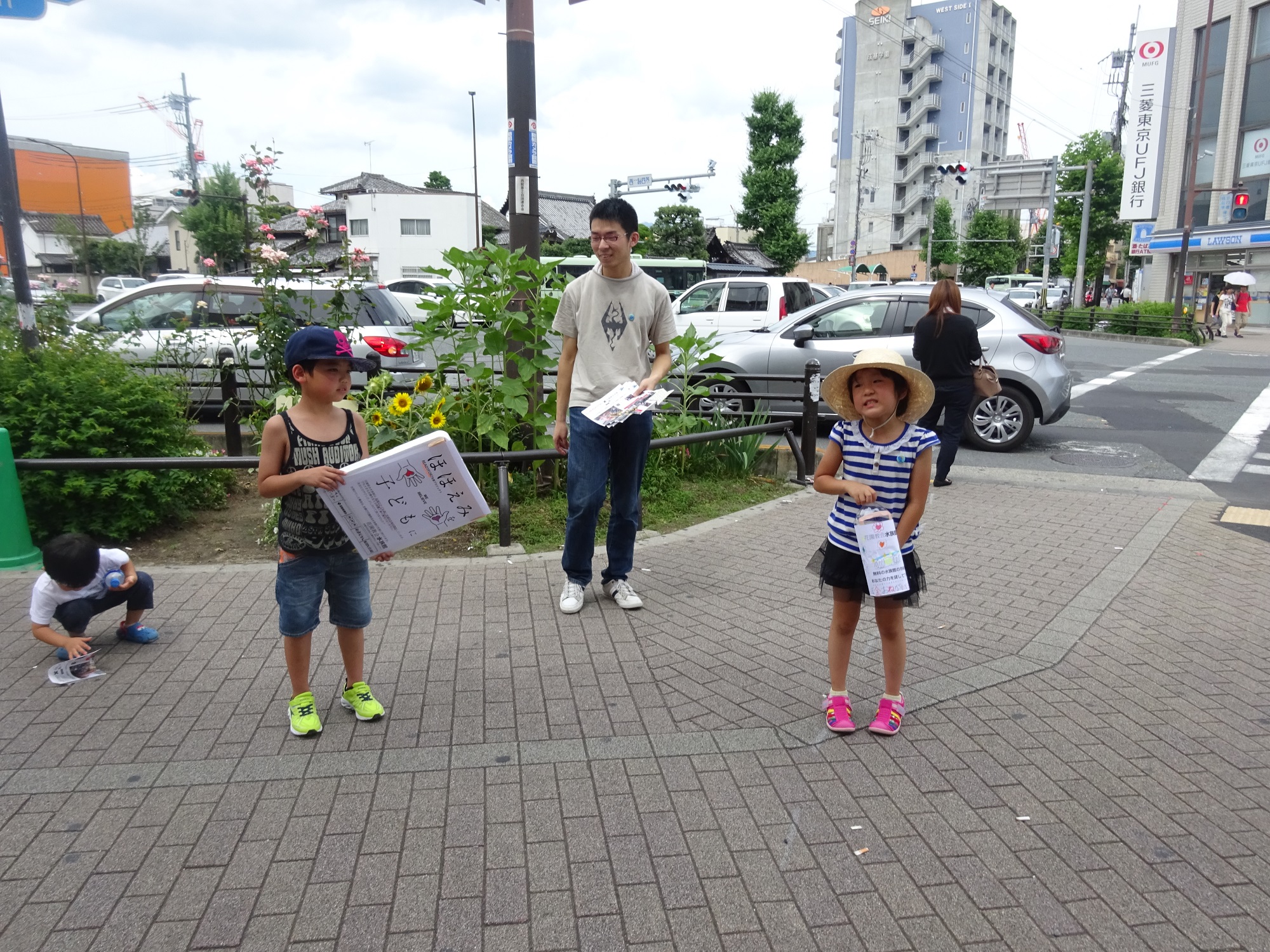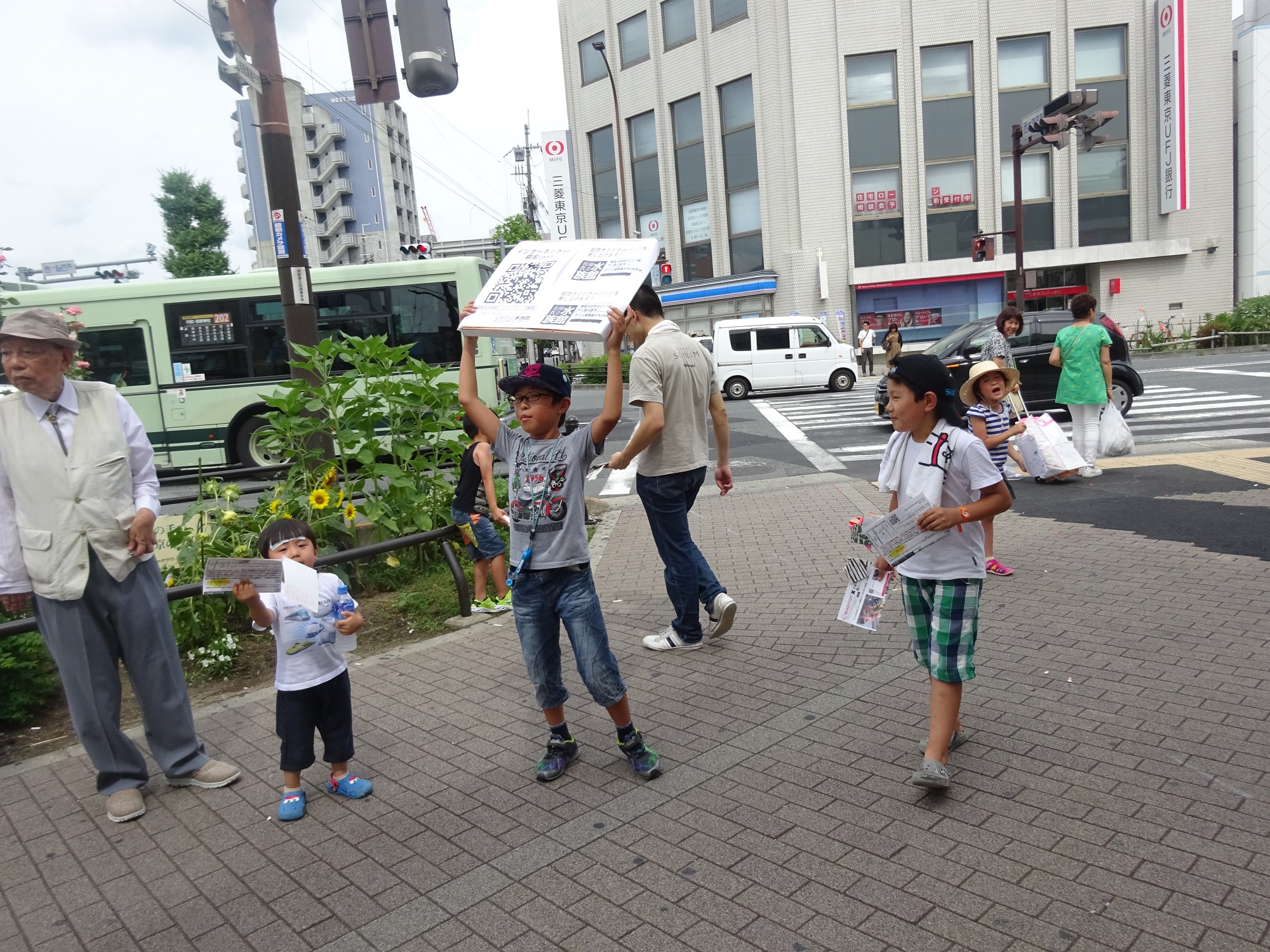 そしたら子ども達は、信号待ちをしている通行人のところに走って行ってチラシを積極的に配り始めました。